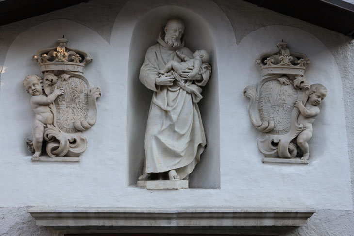 Der Heilige wird von zwei Wappen flankiert, beide gekrönt und auf der Außenseite von einem Putto gehalten. Beide Wappenkartuschen tragen folgende Umschrift: "MARIA ANNA COM(IT)ES(SA) PALATINA RHENI REGINA HISPA(NAE)". Das verweist auf Maria Anna von Pfalz-Neuburg (28.10.1667-16.7.1740), die Tochter von Kurfürst Philipp Wilhelm von der Pfalz (24.11.1615-12.9.1690) und dessen zweiter Ehefrau, Elisabeth Amalie Landgräfin von Hessen-Darmstadt (20.3.1635-4.8.1709). Sie wurde am 4.5.1690 mit dem spanischen König Carlos II. von Habsburg (6.11.1661-1.11.1700) verheiratet, Sohn von König Philipp IV. von Spanien (8.4.1605-17.9.1665) und Maria Anna von Österreich (23.12.1634-16.5.1696). Für ihn war es die zweite Ehe. Der Bezug zu Klausen entstand dadurch, daß der aus Klausen stammende Kapuzinerpater Gabriel Pontifeser (1653-1706) Beichtvater dieser spanischen Königin war und sie dazu brachte, dieses Kloster zu stiften, das 1699-1701 errichtet wurde. Der Verursacher wurde am 9.4.1653 auf der Frag in Klausen geboren und wuchs als Christian Pontifeser auf. Er promovierte zum Doktor der Philosophie, trat dann in Augsburg in den Kapuzinerorden ein. Die Priesterweihe erhielt er 1679. 1682 kam er an den pfalz-neuburgischen Hof und wurde Beichtvater der kurfürstlichen Familie. Er war also der enge Vertraute des Vaters der zukünftigen spanischen Königin, und dann auch von ihr selbst. Er folgte ihr nach Spanien. Alle persönlichen Ehrungen lehnte er stets ab, seine einzige Bitte war dieses Kloster, und dieser Bitte folgte die spanische Königin. Am 6.10.1699 fand die Grundsteinlegung statt. Schon 1701 konnte die Kirche geweiht werden. Gabriel Pontifeser, der auch während des Spanischen Erbfolgekrieges loyal zu der Königin hielt, verstarb in Klausen 1706, als er von Augsburg kommend hier Station machte.