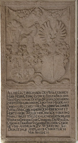Dieses Grabdenkmal ist in der Vorhalle der Pfarrkirche an einem Pfeiler angebracht. Die Platte ist durch den umlaufenden Schmuckrahmen mit einer gestalterisch gleichen Horizontalverbindung zweigeteilt, oben die Wappenzone mit zwei Vollwappen unter zwei Fruchtgebinden, unten die Textzone. Die dreizehnzeilige Inschrift im unteren Teil der weißmarmornen Platte lautet: "ALLHIE LI(E)GT BEGRABEN DER WO(H)LGEBOREN(E) / HERR HERR GEORG LVDWIG FYEGER FREYHERR / VON HIRSCHPERG DER FIRS(TLICHEN) DV(RCHLAVCHT) LEOPOLD ERZHÖRZOG / ZV ÖSTER(REICH) HO(C)HLO(E)BLI(C)HSTER GED(A)ECHTNVS HINDERLAS(SE)NER / ÖRBEN O(BER)Ö(STERREICHISCHER) REGEMENTS VICE PRAESIDENT SALZMAYER / ZV HALL VND GERICH(T)SHERR DER HERRSCHAFFT / HORTENBERG, WELLICHER DEN 3 OCTOBER 1642 / 73 IA(H)R(E) ALTT IN GOTT SE(E)LIGKHLICHEN ENTSCHLAFEN / WIE AVCH DESSEN EHE GEMAHEL DIE WO(H)LL ED(E)L / GEBOR(E)NE FRAV FRAV SVSANNA FYGERIN GEBOR/(E)NE VON ANDRIAN ZV WERBVRG SO / DEN 12 IVLY 1655 GANZ CHRISTLICH / VERS(C)HI(E)DEN". Es handelt sich also um Georg Ludwig Fueger Freiherr von Hirschberg (1569-3.10.1642) und seine Frau, Susanna von Andrian zu Werburg (-12.7.1655). Georg Ludwig von Fueger, Sohn von Karl von Fueger und Anna Maria von Taxis, war 1602 oberösterreichischer Regimentsrat, und er visitierte 1612 in kaiserlichem Auftrag die Verwaltung der österreichischen Vorlande. In Hall war er ab 1603 Salzmaier und bekam schließlich die Leitung des gesamten Salzhandels übertragen. Am 7.7.1605 wurde er Landrat. Später sehen wir ihn als Regiments-Vizepräsident. 1639 bekam er Ärger, weil ihm jemand "Sittenlosigkeit und liderliche Amtsgebahrung" im Amt des Salzmaiers vorwarf; er wurde suspendiert, aber 1642 nach ergebnislosem und letztendlich eingestellten Prozeß rehabilitiert. Die Inschrift nennt Fueger auch als Gerichtsherr von Hörtenberg. Er hatte am 11.11.1608 Susanna von Andrian-Werburg geheiratet.