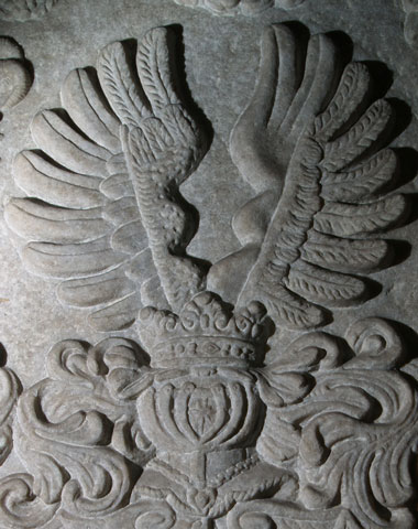 Zum Wappen der Ehefrau, Susanna von Andrian zu Werburg (-12.7.1655): Das Wappen Andrian ist typischerweise rot-silbern gespalten mit einer halben Sturzspitze in verwechselten Farben, auf dem Helm mit rot-silbernen Decken ein Flügel, rot-silbern gespalten mit einer halben Sturzspitze in verwechselten Farben. Alternativ kann man das Motiv auch als silbern-roten Deichselschnitt mit gespaltener Spitze ansprechen. Das Wappen wird so beschrieben im Siebmacher Band: Stei Tafel: 13, Band: Tir Seite: 1 Tafel: 1, weiterhin im Münchener Kalender 1922, dort nach der Tiroler Adelsmatrikel und mit einem rot-silbern bewulsteten Helm. Im Fürstschen Wappenbuch wird die Familie "von Murentein" genannt und mit einem abweichenden Schildbild gezeigt, nämlich mit einer bis zum Schildfuß reichenden Sturzspitze, ggf. leicht eingebogen. Dieselbe Form des Schildes und eine Variante bezüglich der Helmzier kann man auf dieser Grabplatte in der Vorhalle der Stadtpfarrkirche sehen: Hier ist die Helmzier ein offener Flug, der insgesamt mit dem Schildbild belegt ist - also Spaltung in der offenen Mitte, und jeder Flügel einmal schräg geteilt, rechts schrägrechts, links schräglinks. Die Variante mit der bis zum unteren Schildrand reichenden Sturzspitze ist auch mehrfach in der Fischnaler-Wappenkartei belegt. In der Fischnaler-Wappenkartei kommt als Helmzier auch mehrfach ein Flug vor, wobei jeder Flügel für sich mit dem Schildbild belegt ist. Das alles illustriert die Variationsbreite dieses Wappens: Zwei verschiedene Höhen der gestürzten Spitze, entweder bis unten oder nur bis zur Mitte, drei Varianten des Kleinods, entweder ein Flügel mit dem Schildbild, oder ein Flug entweder insgesamt oder jeder Flügel für sich mit dem kompletten Schildbild belegt.