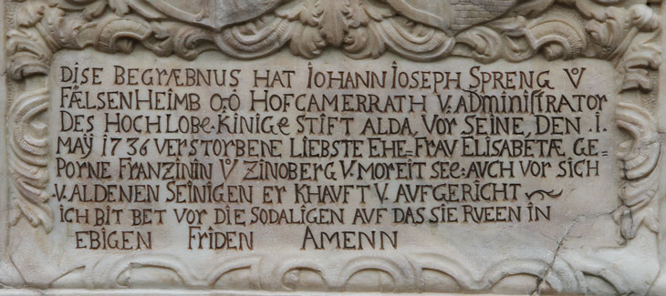 Die kleinste der drei Zonen ganz unten wird von der achtzeiligen Inschrift eingenommen, vertieft und mit schwarz gefaßten Lettern, in selbst für diese Zeit merkwürdiger Orthographie, in vornehmlich Majuskeln, aber mit eingestreuten Minuskeln, und mit wahlweise verwendeten großen und kleinen Buchstaben "R": "DI(E)SE(S) BEGrAEBNUS HAT IOHANN IOSEPH SPRENG VO(N) / FAELSENHEIMB O(BER)Ö(STERREICHISCHER) HOFCAM(M)ERRATH V(ND) ADministRATOr / DES HOCHLO(E)Bl(ichen) KINIGl(ichen) STIFT(S) AL(L)DA, Vor (=FÜR) SEINE, DEN I. / MAY 1736 VErSTOrBENE LIEBSTE EHE=FrAV ELISABETAE GE= / POr(E)NE FrANZININ VO(N) ZINOBErG V(ND) MOrEIT SEl(ig): AVCH VOr (=FÜR) SICH / V(ND) AL(L) DENEN SEINIGEN ErKHAVFT V(ND) AVFGERICHT(ET) / ICH BIT(TE) BET(E) VOr (=FÜR) DIE SO DA LI(E)GEN AVF DAS(S) SIE RVE(H)EN IN / EBIGEN (=EWIGEM) FRI(E)DEN AMENN". Es handelt sich also um ein Familienbegräbnis, das Johann Joseph Spreng von Felsenheim aus Anlaß des Todes seiner Ehefrau 1736 hat aufstellen lassen, zunächst für seine Frau, Elisabeth Franzin von Zinnenberg und Mareit, aber auch für sich und andere Anverwandte. Besagter Johann Joseph Spreng von Felsenheim war oberösterreichischer Hofkammerrat und Administrator des königlichen Damenstifts in Hall.