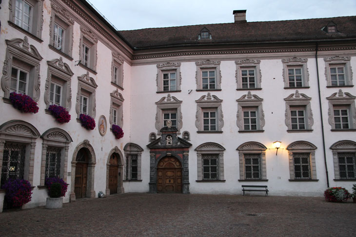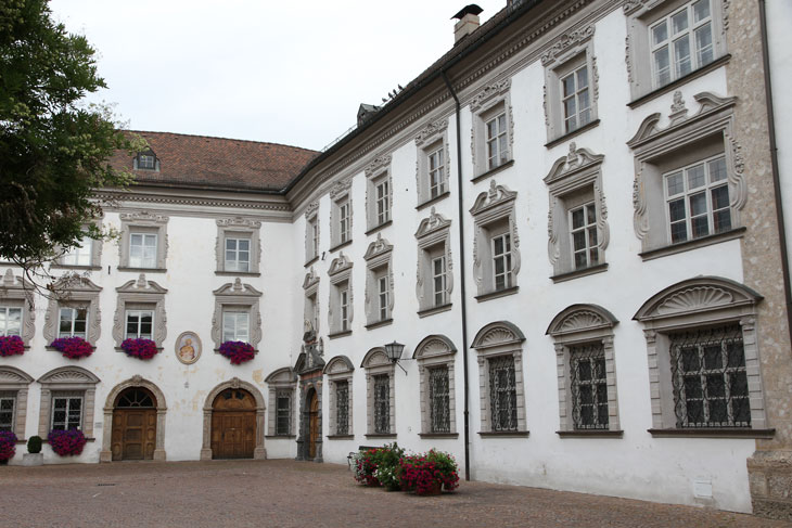 Es gibt an dem längeren platzseitigen Flügel mehrere Portale mit Wappenschmuck. Das Stiftsportal (Abb. oben) befindet sich ganz links (nördlich) nahe dem Eck zum kurzen Flügel und dem dortigen eigentümlichen geknickten Eckfenster. Dem gesprengten Dreiecksgiebel ist eine von ionischen Pilastern flankierte Figurennische eingestellt, die einen gesprengten Segmentbogengiebel trägt, in dessen Lücke ein Sockel einen freistehenden weißmarmornen Wappenstein trägt, der in Höhe der Mitte des Fensters des ersten Obergeschosses positioniert ist. Seitlich enthalten zwei symmetrische Muschelnischen jeweils eine Kugel auf einem Sockel. Das aus der barocken Umbauphase stammende Wappen ist vierlagig aufgebaut und wird von einer Krone überhöht. Der Schild wird von der Ordenskette des Ordens vom Goldenen Vlies umgeben. Der Umbau wurde zwar 1692 begonnen, und in dieser Zeit war der Landesherr von Tirol Erzherzog Leopold Ignaz Joseph Balthasar Franz Felician von Österreich (9.6.1640-5.5.1705), Leopold IV. von Tirol bzw. Kaiser Leopold I. Das Wappen paßt aber nicht zu diesem, sondern muß nach 1711 entstanden sein.