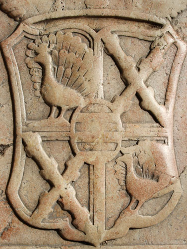 Der nachfolgend abgebildete herrliche Stein aus Rotmarmor wurde für Christian Tänzl geschaffen, wie die umlaufende Inschrift verrät. Die Familie Tänzl ist mit dem Schwazer Silberbergbau groß geworden. Es war ein kometenhafter Aufstieg der Familie in nur wenigen Generationen. Alles begann mit dem bürgerlichen Kaufherrn Jakob Tänzl in Innsbruck. Damals war Schwaz noch ein bedeutungsloses Nest - bis man 1420 dort Silber fand, und bald wußte man, daß es ein ganzer Berg voll Silber war, das ganze Bergbaurevier Falkenstein wartete auf Mutige, die bereit waren, ihre bürgerliche Existenz in der Stadt aufzugeben und der Gold-, nein Silbergräberstimmung zu folgen. Jakob Tänzl (-1472) war einer der ersten. Bereits 1430 wurde er Gewerke (Bergunternehmer) in Schwaz. Kaiser Friedrich III. verlieh 1441 die Grubenlizenz bei der Herrengrube. Schon 1463 förderte der bald eine führende Rolle im Silberbergbau spielende Jakob Tänzl die Menge von 151 kg Silber. Er legte den Grundstein für das sagenhaft erfolgreiche Bergunternehmertum der Familie. Gleichzeitig trat er als Stifter der Pfarrkirche in Hall, von St. Jakob in Innsbruck und der Pfarrkirche in Imst auf, wobei er ab 1462 den Neubau der letzteren erheblich förderte. Auch bei St. Jakob in Innsbruck war er seit 1459 Kirchenpropst und Bauleiter. Sein um 1430 geborener Sohn Christian übernahm das Geschäft; seine Töchter wurden mit je 12000 fl. Mitgift in andere Gewerkenfamilien verheiratet, Eleonore Tänzl mit Hans Jöchl, der in Sterzing aktiv war, und Christina Tänzl mit Hans Fueger, der auch in Schwaz grub. Am Pfeiler der Familie Jöchl in der Pfarrkirche Sterzing erinnert ein Wappen an Eleonore, ein weiteres an der geschnitzten Holzdecke im Ansitz Jöchlsturn in Sterzing, und am Schmiedeeisen-Gitter der Westempore der Pfarrkirche Hall erinnert ein Wappen an Christina und ihren Mann.