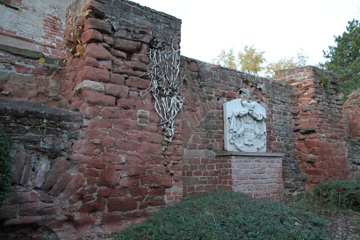 An der Südostseite des Schlosses gibt es einen Durchgang zur Gartenstraße, und hier führt der Weg durch eine Ruine des alten, im Dreißigjährigen Krieg bis auf die Keller zerstörten Schlosses (Abb. oben) des Grafen Emich von Falkenstein (Stephanskapellenweg) aus der Zeit 1589-1595. Er war der erste, der in Bretzenheim selbst residierte, während alle anderen Inhaber der Ortsherrschaft in ihren Burgen und Schlössern außerhalb des Ortes lebten und ihre Rechte vor Ort durch einen Amtmann wahrnehmen ließen. Bis 1620 lebte er auf diesem Schloß, dann wurde es zur Ruine. Der uns interessierende Wappenstein ist inmitten der Umfassungsmauern mit Rundturm und Torbogen aufgestellt und ist über Anfang der 1970er Jahre geschaffene Öffnungen in beiden Stirnseiten des ehemaligen Saales zugänglich. Dieser Wappenstein ist ein moderner Erinnerungsstein. Der Graf von Velen ließ in der zweiten Hälfte des 17. Jh. einen neuen Schloßtrakt erbauen, der nach 1820 in eine Scheune umgebaut wurde. Auch Fürst Karl August von Bretzenheim hatte nie seine Residenz in Bretzenheim, deshalb war für ihn auch kein Schloß nötig.