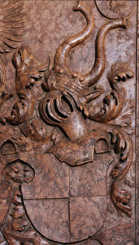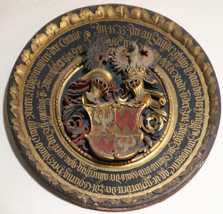 Die Wappenzone der Grabplatte enthält ein großes Allianzwappen des Ehepaares. Heraldisch rechts sehen wir das erste vermehrte Wappen der Trapp von Matsch, geviert, Feld 1 und 4: in Silber ein zweimal eckig nach unten gezogener, roter Balken (Doppelsturzsparren, Stammwappen), Feld 2 und 3: in Gold eine auffliegende, natürliche (schwarze) Trappe (redend Trapp), dazu zwei Helme: Helm 1 (rechts): auf dem ungekrönten Helm mit rot-silbernen Decken auf einem niederen roten, hermelingestulpten Hut ein schwarzer Flug (Trappenflug, Stammhelm Trapp), Helm 2 (links): auf dem gekrönten Helm mit schwarz-goldenen Decken eine auffliegende natürliche Trappe (redend Trapp). Die Trapp, die eigentlich zum steirischen Uradel gehören und seit der Mitte des 15. Jh. in Tirol ansässig waren, besaßen bereits seit 1469 bereits das Amt eines Erblandhofmeisters von Tirol, das zuvor den von Weispriach wegen Treuebruchs entzogen worden war. Das Stammwappen, wie es auch im Scheiblerschen Wappenbuch auf Folio 142 abgebildet wird, zeigt in Silber einen zweimal eckig nach unten gezogenen, roten Balken (Doppelsturzsparren), auf dem Helm mit schwarz-goldenen Decken auf einem goldenen Hut ein schwarzer Flügel (halber Flug). Im Siebmacher Band: Tir Seite: 17 Tafel: 20 ist es ein roter, mit Hermelin aufgeschlagener Turnierhut, darauf ein schwarzer Flügel. Eine weitere Darstellung des Wappens findet sich in Siebmacher Band: Bay Seite: 23b Tafel: 18, mit korrekt angegebenem vermehrtem Wappen, aber mit einem fehlerhaften, weil farblich invertierten Stammwappen. Als gevierte Wappen mehr und mehr üblich wurden, ergänzten die Trapp ihr Stammwappen um ein redendes Element in Schild und Oberwappen. Es ist also eine Vermehrung, der kein Hinzuerwerb von Besitz oder Ansprüchen zugrunde liegt. Erst mit der Matsch-Heirat kam es zu einer begründeten Vermehrung, dazu siehe unten.