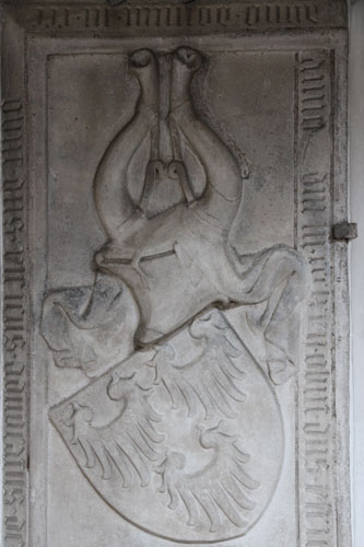 Nach den Äbten kommen wir noch einmal zurück auf die Vögte von Matsch, die 1160-1421 die Vogtei über das Kloster Marienberg innehatten und es zu ihrer Grablege machten. Dieser in der Kirche an der Wand aufgestellte Grabstein ist für Ulrich III. Vogt von Matsch (-1366/1367), seinen Sohn Ulrich IV. Vogt von Matsch (-1402) und dessen Frau Agnes von Kirchberg (-1401). Die Vögte von Matsch führten als Stammwappen in Silber drei (2:1) blaue hängende Flügel (Abb. links: obere Hälfte der Grabplatte). Vereinzelt kann man auch eine Variante mit nur einem Flügel finden, so im Wappensiegel Eginos IV. aus dem Jahre 1310. In der um 1340 entstandenen Wappenrolle von Zürich findet sich die älteste bekannte farbige Darstellung. Auf dem Helm werden zwei Hifthörner geführt, das rechte silbern, das linke rot, jedes mit einem Band in verwechselten Farben. Im 15. Jh. werden aus den Hifthörnern Büffelhörner, so zu sehen im Bruderschaftsbuch von St. Christoph am Arlberg und im Scheiblerschen Wappenbuch. Im Wappenbuch des Conrad Grünenberg sind die Büffelhörner golden bebändert. Die Helmdecken sind blau-silbern oder rot-silbern.
