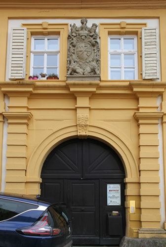 Über dem von Rustikaquadern eingefaßten Portal ist zwischen den beiden Fenstern des Obergeschosses das Wappen des Würzburger Fürstbischofs Johann Philipp von Greiffenclau-Vollraths (13.2.1652-3.8.1719, amtierte 1699-1719) angebracht. Es ist geviert, Feld 1: "Fränkischer Rechen" = von Rot und Silber mit drei aufsteigenden Spitzen geteilt, Herzogtum zu Franken, Feld 2 und 3: erneut geviert: Feld a und d: silbern-blau geteilt, darüber ein goldenes Glevenrad, Stammwappen der von Greiffenclau-Vollraths, Feld b und c: in Schwarz ein silberner Schräglinksbalken, Herrschaft Ippelbrunn (Eppelborn), Feld 4: "Rennfähnlein" = in Blau eine (von der Stange aus gesehen) rot-silbern gevierte, schräglinksgestellte und an den beiden senkrechten Seiten je zweimal eingekerbte Standarte mit goldenem Schaft, Hochstift Würzburg.