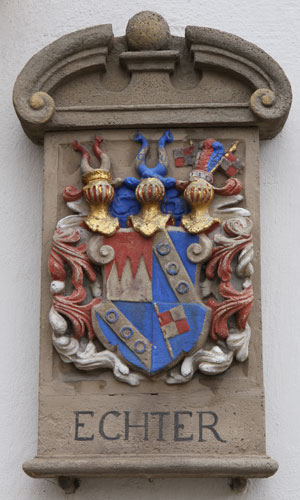Das Wappen des Würzburger Fürstbischofs Julius Echter von Mespelbrunn (18.3.1545-13.9.1617, amtierte 1573-1617) ist geviert, Feld 1: "Fränkischer Rechen" = von Rot und Silber mit drei aufsteigenden Spitzen geteilt, Herzogtum zu Franken, Feld 2 und 3: in Blau ein silberner Schrägbalken, belegt mit drei blauen Ringen, Stammwappen der Echter von Mespelbrunn, Feld 4: "Rennfähnlein" = in Blau eine rot-silbern gevierte, an den beiden senkrechten Seiten je zweimal eingekerbte, schräggestellte Standarte mit goldenem Schaft, Hochstift Würzburg. Zum Wappen gehören drei Helme: Helm 1 (Mitte): ein Paar blauer Büffelhörner, jeweils einwärts belegt mit einem silbernen Schrägbalken, der wiederum mit drei blauen Ringen belegt ist, Helmdecken blau-silbern, Stammwappen der Echter von Mespelbrunn, Helm 2 (rechts): ein Paar Büffelhörner, jeweils im Spitzenschnitt rot-silbern geteilt, Helmdecken rot-silbern, Herzogtum zu Franken, Helm 3 (links): auf einem Fürstenhut drei Straußenfedern in den Farben Silber, Rot und Blau (Reihenfolge kann variieren) zwischen zwei rot-silbern gevierten Standarten mit goldenem Schaft, Helmdecken rot-silbern, Hochstift Würzburg. Schwert und Krummstab fehlen.