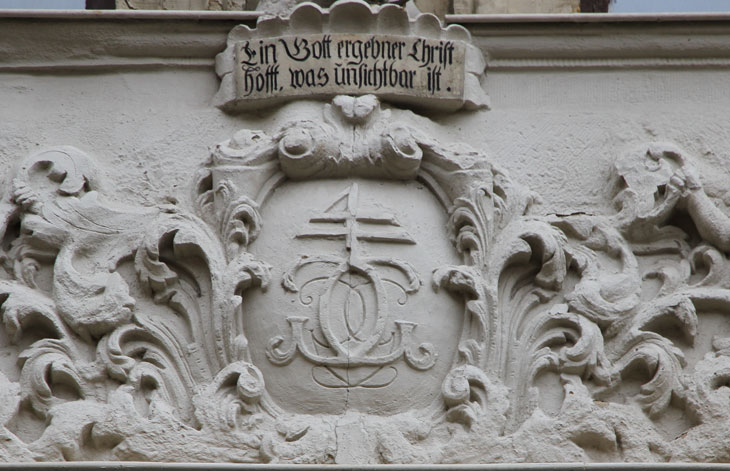 Den Portalbogen ziert wieder die Jahreszahl 1725, in zwei Ziffernpaare aufgetrennt durch das Wappen der Familie Günther, das eine eingebogene, mit einem Stockanker belegte und von zwei schräg einwärts gelegten Fischen begleitete Spitze zeigt, auf dem gekrönten Helm eine wachsende Mannesfigur mit einem unten aufgestützten Stab in der Rechten. In der gegenwärtigen Fassung sind alle Felder blau, die Fische silbern, der Anker schwarz, die Helmdecken grün, vermutlich eine willkürliche Farbwahl. Mangels Siebmacher-Eintrag konnten die Farben nicht verifiziert werden, Hinweise willkommen.