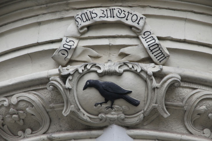 Der Hausname "Zur Groe" bezieht sich auf die schwarze Krähe, die auf der Fassade am Unterbau des runden Eckerkers dargestellt wird, das mehrfach gefaltete Schriftband darüber trägt den Wortlaut: "Das Haus zur Groe genannt". Das ist jedoch am Barockbau von der Funktion her ein Hauszeichen. Dennoch hält diese Krähe die Erinnerung wach an einen Vorgängerbau mit Schankwirtschaft, der im Dreißigjährigen Krieg untergegangen ist, an das Gasthaus "Zur Krähe". Und dieses wiederum gehörte der Familie Groe, eine für Marktbreit sehr wichtige Familie, die auch einen bedeutenden Schultheißen stellte, nämlich Niklaus Groe, der durch seine Bautätigkeit während seiner 1590-1622 währenden Amtszeit den Ort entscheidend mitgestaltete. Diese Familie führte als Wappenbild die Krähe. Wir sehen also den Übergang vom Familiennamen und Familiensymbol zu einem Namen und Zeichen für eine Schenke, von dieser ging die Bezeichnung samt Symbol auf das Haus über, und beim Neubau wurde die Hausbezeichnung als Hauszeichen beibehalten, obwohl das eigentlich einmal das Wappentier der Familie Groe war, hier aber keinerlei Besitzanspruch markiert, sondern lediglich Erinnerung ist: Das Wappen ist zu einem Hauszeichen geworden.
