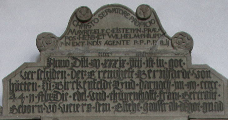 Der Schlüssel zur Zuordnung der Personen sind die beiden Inschriften im Aufsatz. Die fünfzeilige Hauptinschrift nennt die Personen und ihre Lebensdaten: "Anno D(omi)ni m ccccc xxxix viii mai ist in got(t) / verschi(e)den Der E(h)renvhest Bernhardt von / hutten zu Birckenfeldt Und darnach im m ccccc / 44 ii febr(uari) Die edel und thugenthafft(e) fraw Gertraut / Gebor(e)n(e) vo(n) weiers sein(e) E(he)liche hausfrab de(r) got(t) gnad(e)". Es handelt sich also um Bernhard von Hutten (1474-8.5.1539) aus der Linie zu Birkenfeld und Gertraud von Ebersberg gen. Weyhers (-2.2.1544). In der ersten Jahreszahl ist das "ccccc" offensichtlich vergessen worden oder anfänglich im Layout nicht eingeplant gewesen, und dann nachträglich auf dem oberen Rand ergänzt worden, mit hochgestelltem "o", ebenso der Monatsname Mai. Bei den Daten für die Ehefrau verwundert der Wechsel zu arabischen Ziffern, das liegt daran, daß das Epitaph anläßlich des Todes des Ehemannes angefertigt wurde, und man hatte zu wenig Platz gelassen, als man das Datum der Ehefrau nachtragen mußte. "44 ii febr" ist deutlich kürzer als "xl iv februarii" oder gar die Langform "xxxx iiii februarii".