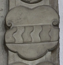 Die Eltern von Gertraud waren Eberhard von Ebersberg gen. Weyhers und Elisabeth Margareta von Hutten. Gertrauds vier Großeltern waren Hans von Ebersberg gen. Weyhers und seine Frau Barbara von Steinau gen. Steinrück sowie Lorenz von Hutten und Elisabeth von Thüngen. Wir sehen auf der Spindelseite übereinander die Wappen der von Hutten (in Rot zwei goldene Schrägbalken, hier schräglinks), von Thüngen (in Silber ein fünfmal rot-golden im Wellenschnitt gespaltener Balken) und der von Steinau genannt Steinrück (in Silber drei (2:1) schwarze, fünfspeichige Wagenräder), alle drei Abb. unten. Auch hier gibt es eine Unregelmäßigkeit, denn eigentlich müßten die beiden unteren Schilde andersherum angeordnet sein, Steinau vor Thüngen, und so ist es auch am Epitaph für den Sohn Wilhelm korrekt gehandhabt worden (siehe in dessen Kapitel).