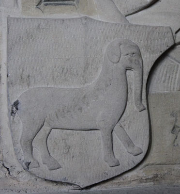 Bei einer Ahnenprobe würde man die folgenden vier Wappen erwarten: von Rechberg, von Hirschhorn, von Helfenstein, Wild- und Rheingrafen von Dhaun. Tatsächlich sehen wir in der Mitte oben das Wappen der von Hutten mit schräglinken Balken für ihre Ehe, heraldisch rechts oben eine Wiederholung des Hutten-Wappens, aber mit schrägrechten Balken, wobei die Duplizität keinen rechten Sinn ergeben will, links oben das Wappen der von Rechberg (in Gold zwei Löwen Rücken an Rücken mit verschlungenen Schwänzen, Linie Hohenrechberg), rechts unten das unschön nachgearbeitete Wappen der Grafen von Helfenstein (in Rot ein silberner Elefant, hier einwärts gewendet, normalerweise noch auf einem Dreiberg stehend, der hier weggelassen wurde) und links unten einen Schild mit einem Viereck, das gar nicht in die oben aufgezeigte Genealogie paßt und nicht erklärbar ist, vielleicht ein Produkt der Restaurierung und eine Verwechslung, so wie man sich auch bei der Jahreszahl vertan hat.