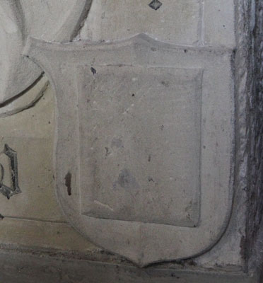 Vier Wappenschilde befinden sich in den Ecken der Platte und unterbrechen die Inschrift. Heraldisch oben rechts ist nach erstem Anschein der Schild der von Hutten zu sehen, das wären in Rot zwei goldene Schrägbalken. Gegenüber sehen wir unzweifelhaft und unverwechselbar den Schild der von Sickingen, in Schwarz fünf (2:1:2) silberne Kugeln. Die beiden unteren Wappen gilt es nun zu klären, und dafür gibt es zwei Ansätze. Die erste Theorie nimmt den ersten Anschein und ordnet die beiden oberen Schilde den von Hutten und den von Sickingen zu, also Ehemann und Ehefrau. Das heißt, wir erwarten unten die Wappen der Mütter beider Ehepartner, rechts Frankenstein, links Sien. Beides ist nicht der Fall, beides kann man nicht in das Vorhandene hineinsehen. Unten rechts ist nichts mehr richtig zu erkennen, irgendein kreisförmiges Objekt, unten links eine Spaltung und zwei Zwillingsleisten. Theorie 1 trifft also nicht zu und stimmt nicht mit den vorhandenen Spuren im Stein überein.