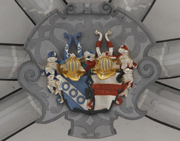 Der Chor der Laurentius-Kirche ist in spätgotischem Stil erbaut worden mit einem Stichkappengewölbe und einem mächtigen Schlußstein, an dem sechs der Gewölberippen zusammenlaufen. Dort ist auf einem Untergrund mit Rollwerk erneut das Wappen des Stifterehepaares angebracht, diesmal farbig gefaßt. Das Paar hatte 12 Kinder.