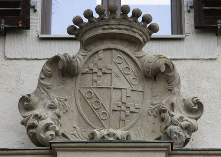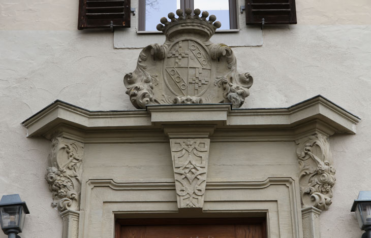 Deshalb ist über dem etwas aus der Mitte gerückten, auf der Südseite gelegenen Portal mit seitlichen, schräg herausgestellten Wandpfeilervorlagen und mehrfach geknicktem Architrav und mit einer zweiläufigen Freitreppe davor auch ihr Wappen angebracht, dieses ist geviert, Feld 1 und 4: in Schwarz ein rot-golden in zwei Reihen geschachtes durchgehendes Kreuz (von Ingelheim), Feld 2 und 3: in Blau ein silberner, mit drei blauen Ringen belegter Schrägrechtsbalken (Echter von Mespelbrunn). Das Wappen wird hier ohne Helme geführt, dafür von einer neunperligen Grafenkrone bedeckt. Der Wappenschild ist also seit 1698 in dieser Form existent, die Grafenkrone ist ab 1737 möglich, und am Gebäude ergibt sich aufgrund der Besitzverhältnisse eine Untergrenze des Jahres 1802. Den Keilstein ziert ein geometrisches Beschlagwerkornament, die seitlichen Kapitelle sind floral verziert.