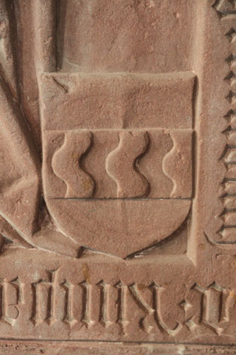 In den vier Ecken des Zentralfeldes sind vier Wappenschilde der Ahnenprobe angebracht; die Inschrift wird nicht überlappt. Neben den beiden oberen Schilden sieht man ornamentales Sprengwerk. Heraldisch rechts oben sehen wir den einwärts gewendeten Schild der von Grumbach, in Gold ein schwarzer Mohr, der in der Hand einen Strauß mit drei roten Blumen hält, die andere Hand eingestemmt, gegenüber den der von Hutten, in Rot zwei goldene Schrägbalken, unten rechts denjenigen der Rüdt von Collenberg, in Rot ein silberner Rüdenkopf mit Stachelhalsband, hier wiederum einwärts gewendet, und zuletzt links unten den Schild der von Thüngen, in Silber ein fünfmal im Wellenschnitt golden-rot gespaltener Balken.