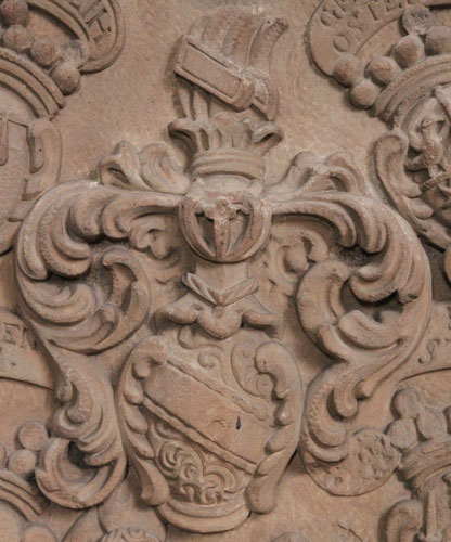 Bei dieser Grabplatte für Anton Franz Friedrich Stein von Nord- und Ostheim (6.10.1701-) ist die biographische Inschrift auf den umlaufenden Rand beschränkt; sie hat den Wortlaut "Antonius Franciscus Fridericus / a Stein Natus Anno 1701 die sexto Octob(ris) ... / ... / ... igesimo Primo Decembris". Die beiden unteren Ecken wurden beschädigt und sind nur der äußeren Form nach ergänzt worden, deshalb ist die Umschrift dort lückenhaft. Die Familie der von Stein zu Nord- und Ostheim stammt aus der Rhön und kommt im Grabfeld und an der Fränkischen Saale vor, auch zwischen Coburg und Bamberg. Ursprünglich waren die Familienmitglieder Ministerialen der Würzburger Fürstbischöfe und der Grafen von Henneberg. Als Lehen der letzteren hatten sie das Unterburggrafenamt zu Würzburg inne. Ihre Lehen hatte die Familie von den Hochstiften Würzburg und Bamberg, vom Kloster Fulda und von den Grafen von Henneberg, später von den Herzögen von Sachsen. Im 13. Jh. hatten sich zwei Linien herausgebildet, eine zu Ostheim und eine zu Nordheim. Erstere erlosch 1705, letztere erbte, und seitdem wurde der kombinierte Name von Stein zu Nord- und Ostheim üblich. Bis 1922 waren die Güter ein Fideikommiß und wurden als Kondominat verwaltet. Am 3.7.1669 erlangte Carl von Stein, der bei den Vorfahren hier auftaucht, von Kaiser Leopold I. den Reichsfreiherrenstand.