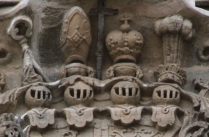 Dazu werden vier Helme geführt, Helm 1 (innen rechts): auf einem roten Kissen eine Inful, Helm 2 (innen links): auf einem Kissen ein Fürstenhut, Helm 3 (außen rechts): zu rot-silbernen Decken ein wachsender behandschuhter Arm, in der Faust einen silbernen Krummstab haltend, Hochstift Eichstätt, Helm 4 (außen links): zu blau-silbernen Decken ein Stoß silberner und blauer Straußenfedern, von Freyberg. Aus den Helmdecken ragen noch schrägrechts der Krummstab und schräglinks das gestürzte Schwert. Es kommt also zweimal ein Krummstab vor, einmal als Teil der Helmzier und einmal als Symbol der geistlichen Macht ohne Helm. In der Mitte ragt senkrecht ein Vortragekreuz zwischen den beiden inneren Kleinoden hervor, es ist aus Metall gefertigt. Das Ganze wird eingerahmt von einer üppigen barocken Kartusche mit Laubgirlanden an den Seiten, mit Blüten- und Fruchtgehängen und einem Muschelornament ganz unten. Wappen dieses Fürstbischofs gibt es mehrfach in Eichstätt, so am Waisenhaus, an den Kavaliershöfen und am Willibaldsaltar im Dom, und es gibt ein weiteres Wappen am ehem. Forstamt Hirschberg in Beilngries.