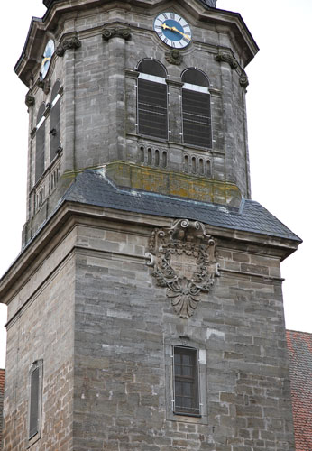 Hoch oben am Turm ist an der Nordwestseite unter dem ersten Dachansatz, also unter dem neu gestalteten Obergeschoß, das Prunkwappen des Eichstätter Fürstbischofs Johann Anton II. Freiherr von Freyberg (lebte 16.7.1674-30.4.1757, amtierte 1736-1757) angebracht. Das Wappen wurde 1745 dort angebracht. Der Schild ist geviert, Feld 1 und 4: in Rot ein silberner aufrechter Krummstab (Bischofsstab), Hochstift Eichstätt, Feld 2 und 3: von Silber und Blau geteilt, unten 3 (2:1) goldene Kugeln, Stammwappen der von Freyberg.