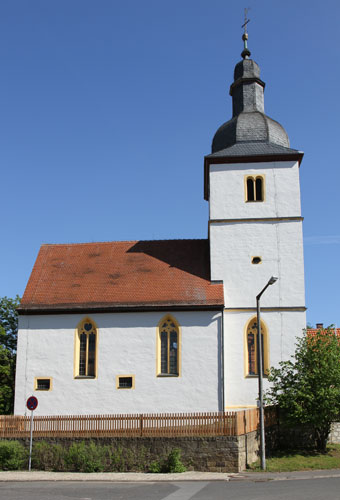 Die evangelisch-lutherische Kirche St. Georg in Herchsheim stammt in ihrer jetzigen Form aus dem Jahr 1613, geht aber auf einen älteren Vorgängerbau zurück, denn bereits für das Jahr 1311 ist eine Kirche im Ort erstmals belegt, und 1321 wurde Herchsheim eine eigene Pfarrei. Die Brüder Hans Georg und Hans Ernst Zobel von Giebelstadt errichteten dann den Neubau 1613 im damals üblichen Echter-Stil, daher die nachgotischen Formen, die spitzbogigen Maßwerkfenster und der typische quadratische Chorturm. Das Langhaus ist ein schlichter Saalbau mit Satteldach. Das Eingangsportal ist vermutlich eine Arbeit aus der Werkstatt von Michael Kern. Der dreigeschossige Turm trägt eine verschieferte welsche Haube. Und dennoch ist die heutige Substanz nicht so historisch, wie es scheint, denn in der Mitte des 19. Jh. kam es zu tiefgreifenden Baumaßnahmen: Eigentlich wollte man nur den baufälligen Turm erneuern, doch dabei stürzten die Außenmauern des Langhauses ein. Also zog man nun nicht nur den Turm, sondern auch das Langhaus unter Verwendung der historischen Werksteine wieder hoch.