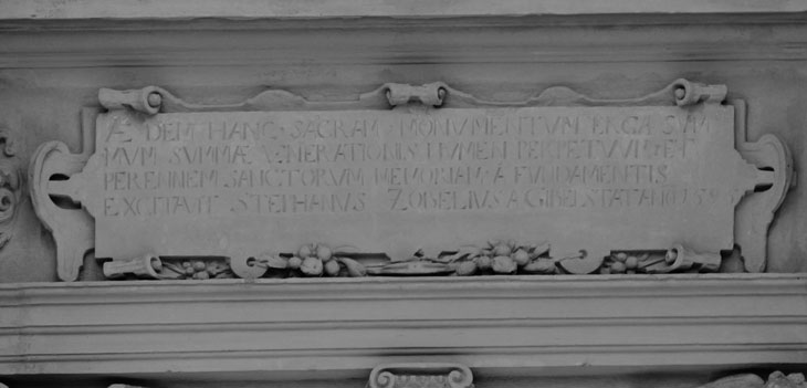 An der Westfassade befindet sich mit dem aus rotem Sandstein gefertigten Renaissance-Portal ein Meisterwerk der Bildhauerkunst. Der Urheber ist Michael Juncker, der auch das schlichtere Seitenportal, das Sakramentshäuschen und den Apostelaltar erschaffen hat. Sein Sohn war Johannes (Hans) Juncker (ca.1582-1624), der den Hochaltar in Darstadt angefertigt hat. Ein anderer Sohn war Zacharias Juncker d. Ä., der den Taufstein in der St. Nikolauskirche in Eibelstadt aus Alabaster gearbeitet hat. Die Bauinschrift auf der Rollwerkkartusche in der Gebälkzone lautet: "AEDEM HANC SACRAM MONVMENTVM ERGA SVM/MVM SVMMAE VENERATIONIS NVMEN PERPETVVM ET / PERENNEM SANCTORVM MEMORIAM A FVNDAMENTIS / EXCITAVIT STEPHANVS ZOBELIVS A GI(E)BELSTA(D)T AN(N)O 1595" - dieses Gebäude, ein sakrales Monument, wurde von Grund auf in die Höhe gezogen im Jahre 1595 von Stephan Zobel von Giebelstadt für die ultimative Verehrung des ewigen Gottes und zum ganzjährigen Gedächtnis der Heiligen.