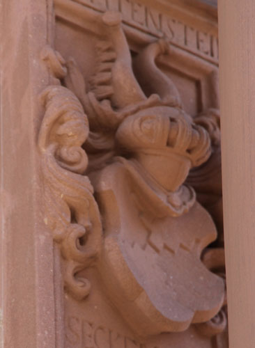 Mit den hinter der optisch linken Säule verborgenen vier Wappen springen wir auf die Ebene der Urgroßeltern des Bauherrn. Das waren väterlicherseits Heinrich Zobel von und zu Giebelstadt, Ritter 1485, und Kunigunde von Lichtenstein, sowie Petrus / Peter von Vinsterlohe und Margarethe von Seckendorff. Deshalb beginnt die Reihe mit dem Wappen der von Lichtenstein, rot-silbern im Zackenschnitt geviert, auf dem Helm mit rot-silbernen Decken ein Paar roter Büffelhörner, außen mit einem Kamm aus silbernen Federn (Abb. unten links), und geht weiter an zweiter Position mit dem Wappen der von Seckendorff, eigentlich in Silber zwei unten verbundene und zu einer Acht verschlungene, sich zweimal überkreuzende rote Lindenzweige mit nach außen gekehrten Blättern, vier auf jeder Seite, hier aber statt dessen etwas ganz Wirres, auf dem Helm mit silbern-roten Decken ein roter Hut, hermelingestulpt, oben mit schwarzen Hahnenfedern besteckt (Abb. unten rechts). Das Seckendorff-Wappen steht hier eigentlich eine Position zu hoch, es müßte gemäß der angegebenen Genealogie an Position 7, nicht schon an Position 6 der Gesamtahnenprobe kommen.