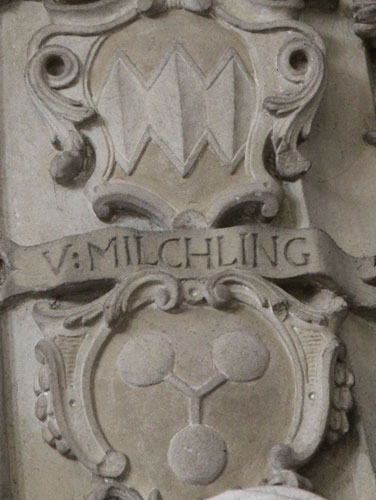 Die Urgroßeltern mütterlicherseits waren Johann Georg von Mauchenheim gen. Bechtolsheim (-1624) und Maria Magdalena von Schutzbar gen. Milchling (-1654) sowie Daniel von Thüngen zu Roßbach und Zeitlofs und Anna Agatha von Mörle gen. Beheim. Als Wappen Nr. 6 finden wir das der von Schutzbar gen. Milchling ("V: MILCHLING", in Silber drei dreipaßförmig zusammengestellte schwarze Kugeln) in der horizontalen Reihe als zweites von links und als Wappen Nr. 8 das der von Beheim gen. Möhrlin ("MÖRLAU GNT BHÖ/ME", auch: von Beheim gen. Möhrlin, geteilt und halbgespalten von Rot, Silber und Schwarz und in der Mitte belegt mit einer rotbebutzten goldenen Rose) als optisch linken Abschluß der Reihe (cave, Verwechslungsgefahr mit den von Mörlau oder von Merlau, das sind die mit dem Jungfrauenadler im Schild).