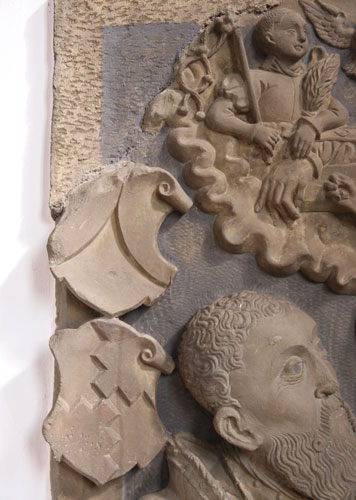 Insgesamt sind an der Platte noch fünf Wappenschilde erhalten. Die obere linke Ecke der Platte ist verloren gegangen und wurde grob ergänzt, deshalb fehlt auch der dortige Wappenschild. Die Zahl sechs paßt zu keiner plausiblen Ahnenprobe, auch fehlen die Hauptwappen, das der von Gebsattel (in Rot Kopf und Hals eines silbernen Steinbocks) und das der von Berlichingen (in Schwarz ein silbernes fünfspeichiges Rad). Deshalb darf davon ausgegangen werden, daß dieses Epitaph früher einmal einen Aufsatz mit den beiden Hauptwappen der Ehepartner trug, der ebenfalls verlorengegangen ist, und daß diese beiden Hauptwappen zusammen mit den einst 6 Randwappen eine 8er-Ahnenprobe bildeten, für jeden Ehepartner auf Großelternebene.