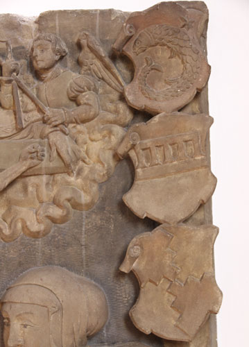 Von den vier Wappen der Ahnenprobe ist dasjenige heraldisch oben rechts fast gänzlich zerstört, man kann aber anhand einer einzigen Wellenlinie noch erkennen, daß es sich einmal um den Schild der von Thüngen gehandelt hatte. Der Schild heraldisch oben links steht für die fränkischen von Lichtenstein, von Silber und Rot im Zackenschnitt geviert, derjenige unten rechts für die von Hutten, in Rot zwei goldene Schrägbalken, hier einwärts gewendet, und der letzte Schild steht noch einmal für die Familie von Thüngen, in Silber ein 5x mit nach links ausgebogenen Linien gold-rot gespaltener Balken. Möglicherweise handelt es sich bei Dorothea um die Ehefrau von Peter von Gebsattel zu Königshofen und Trennfeld (-1491), Hinweise willkommen.