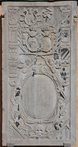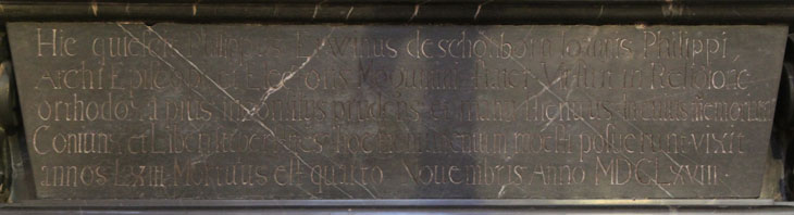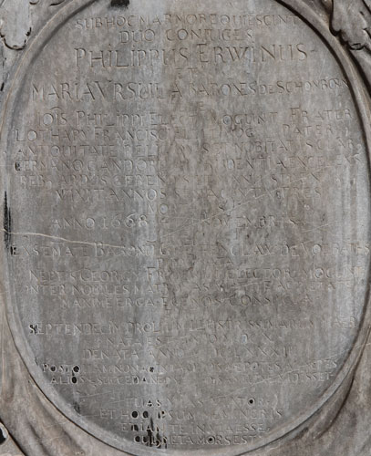 Der oval eingefaßte Text der Platte lautet: "SUB HOC MARMORE QUIESCUNT / DUO CONIUGES / PHILIPUS ERWINUS / ET MARIA VRSULA BARONES DE SCHONBORN / IO(ANN)IS PHILIPPE ELECT(ORIS) MOGUNT(INI) FRATER / LOTHARY FRANCISCI ELECT(ORIS) MOG(UNTINI) PATER / ANTIQUITATE RELIGIONIS ET NOBILITATIS CLAR(US) / GERMANO CANDORE AC PRUDENTIA EXCELLENS / REB(US) ARDUS GERENDIS ET MANU STRENU(US) / VIXIT ANNOS SEXAGINTA TRES / MORTUUS / ANNO 1668 4TA NOVEMBRIS / HAEC EX STEM(M)ATE BARONU(M) GREIFFENCLAW DE VOLLRATHS / PROGNATA / NEPTIS GEORGY FRIDERICI ELECTOR(IS) MOGUNT(INI) / INTER NOBILES MATRONAS VIRTUTE AC PIETATE / MAXIME ERGA EGENOS CONSPICUA / FUIT / SEPTENDECIM PROLIUM ILLUSTRISSIMARUM MATER / NATA EST ANNO MDCX / DENATA ANNO MDCLXXXIII / POSTQUAM NONAGINTA DUOS NEPOTES AC NEPTES / ALIOS SUCCEDANEOS E SUO SANGUINE VIDISSET / I / TUAS VIAS VIATOR / ET HOC IPSUM MEMINERIS / ETIAM TE IN VIA ESSE / CUI(US) META MORS EST". Neben den vielen kurfürstlichen Verwandten muß ebenfalls gesagt werden, daß auch die Ehefrau eine Verwandte eines Wormser Fürstbischofs und Mainzer Kurfürsten ist, denn Georg Friedrich von Greiffenclau-Vollraths (8.9.1573-6.7.1629) war ihr Großonkel. Und der Würzburger Fürstbischof Johann Philipp von Greiffenclau-Vollraths (13.2.1652-3.8.1719; 71007061) war ihr Cousin, was das oben Gesagte noch unterstreicht.