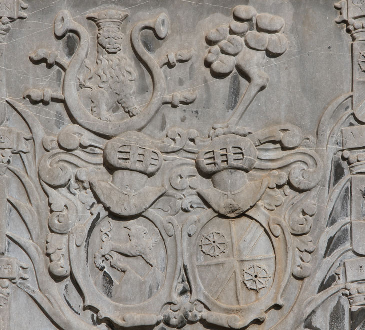 Diese beiden Wappen wiederholen sich an den Seiten ganz oben als Beginn der jeweiligen 4er-Ahnenproben, rechts mit "V. SCHÖNBORN" und links mit "GREIFENCLAU V. VOLRATHS" bezeichnet. Nun folgen auf jeder Seite die vier Ahnenwappen für die Ahnenprobe auf Großelternebene für jeden Ehepartner. Philipp Erwein Freiherr von Schönborn war der Sohn von Georg von Schönborn (-16.4.1613) zu Eschbach, 1605 Amtmann der Grafschaft Runkel in Amöneburg und Neustadt, und dessen Frau, Maria Barbara von der Leyen (-1631). Entsprechend folgt der Wappenschild der von der Leyen ("V. DER LEYEN"), in Blau ein silberner Pfahl; die hier nicht dargestellte Helmzier wäre zu blau-silbernen Decken ein wachsender silberner Rüdenrumpf zwischen einem blauen, mit silbernen Lindenblättern bestreuten Flug. Maria Ursula von Greiffenclau-Vollraths war die Tochter von Heinrich Freiherr von Greiffenclau-Vollraths (30.10.1577-29.5.1638), kurmainzischer Geheimrat, 1605 Oberamtmann zu Bischofsheim an der Tauber, Orb, Hausen und Alzenau, später zu Steinheim, 1630 Vicedom im Rheingau, und dessen Frau, Anna Maria Gräfin zu Eltz (1575-27.1.1640). Entsprechend ist der zweite Ahnenwappenschild auf der Spindelseite derjenige der von Eltz ("V. ELTZ"), geteilt, oben in Rot ein wachsender, goldener, blau bewehrter und ebenso gezungter Löwe, unten silbern und ledig; die hier nicht verwendete Helmzier wäre zu rot-silbernen Decken ein hermelingestulpter roter Turnierhut, aus dem ein goldener, blau bewehrter und ebenso gezungter Löwe wächst zwischen einem mit silbernen Herzchen bestreuten roten Flug.