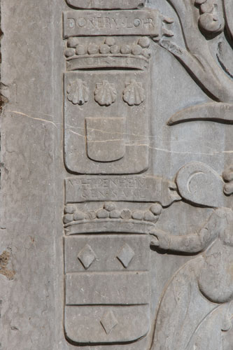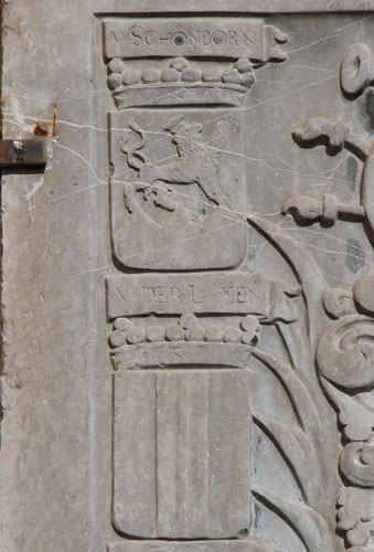 Die vier Großeltern des Philipp Erwein Freiherr von Schönborn waren Philipp von Schönborn (-1589) und Agathe Donner von Larheim/Lohrheim (-12.9.1599) väterlicherseits sowie Philipp Erwein von der Leyen (-10.3.1593), erst 1566 Domherr zu Trier, 1572 Resignation, Rittmeister, und Anna von Heppenheim gen. von Saal mütterlicherseits. Das erste neue Wappen auf dieser Ebene ist das der Donner von Larheim/Lohrheim ("DONER V. LOHR"), in Silber ein rotes Schildchen, im Schildhaupt begleitet von drei balkenweise gestellten schwarzen Jakobsmuscheln; die hier nicht verwendete Helmzier wäre zu rot-silbernen Decken ein rechtes silbernes und ein linkes rotes Eselsohr. Die aus dem Dorf Lohrheim bei Dietz stammende Familie gehört zur im Nassauischen vorkommenden Wappengruppe mit den Grundfarben rot-silbern und dem Schildchen, wobei fast alle Geschlechter eine Rolle als katzenelnbogensche Lehnsleute, Burgmannen o.ä. spielten und sich viele ihrer Wappen sogar durch typische Helmzieren ähneln. Das vierte und letzte Wappen dieser Reihe ist dasjenige der von Heppenheim genannt von Saal ("V. HEPPENHEIM / GEN. SAAL"), in Blau ein silberner Balken, begleitet von 3 (2:1) silbernen Rauten. Die zugehörige Helmzier wäre zu blau-silbernen Decken ein Paar blauer, mit einem silbernen, oben und unten von einer silbernen Raute begleiteten Balken belegter Büffelhörner. Diese Familie stammt aus dem Raum Alzey, hatte in Gau-Heppenheim eine Burg als Allodialgut und stellte Burgmannen auf der bischöflichen Burg in Alzey. Ein weiterer Besitz der Familie war der Saalhof in Alzey, ein Lehen von den Pfalzgrafen bei Rhein. So kam es zu diesem doppelten Namen. Dieses Wappen fand übrigens Eingang in das vermehrte Wappen der Grafen von Schönborn, als diese 1684 die von Heppenheim beerbten, und in deren Wappen fand der Wappenbestandteil der von Heppenheim weite Verbreitung im Rheinland und in Franken, insbesondere im Bereich der geistlichen Fürstentümer Süddeutschlands.