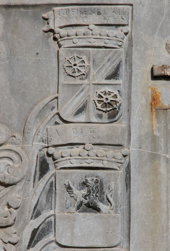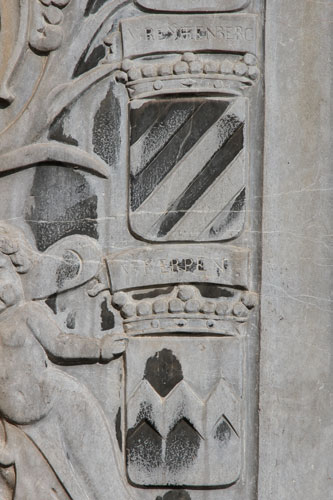 In der Mitte ist ein großes Allianzwappen beider Eheleute angebracht, heraldisch rechts das Wappen der von Schönborn, in Rot auf drei silbernen Spitzen ein schreitender goldener Löwe mit blauer Krone, auf dem ungekrönten Helm mit rot-silbernen Decken der rotgezungte Löwe mit blauer Krone und aufgeschwungenem Schweife sitzend zwischen zwei gänzlich roten Büffelhörnern (die seitlichen Artefakte sind in anderen Darstellungen nicht vorhanden und daher nicht signifikant), gegenüber dasjenige der von Greiffenclau-Vollraths, geviert: Feld 1 und 4: silbern-blau geteilt, darüber ein goldenes Glevenrad, Stammwappen der von Greiffenclau-Vollraths, Feld 2 und 3: in Schwarz ein silberner Schräglinksbalken, Herrschaft Ippelbrunn (Eppelborn), auf dem Helm mit blau-silbernen oder rechts blau-silbernen und links schwarz-silbernen Decken eine goldene Greifenklaue mit schwarz-blau-silbernem Gefieder.