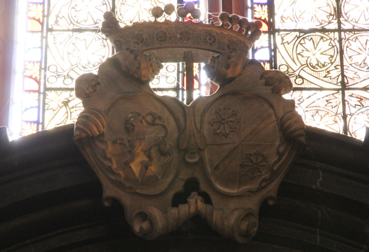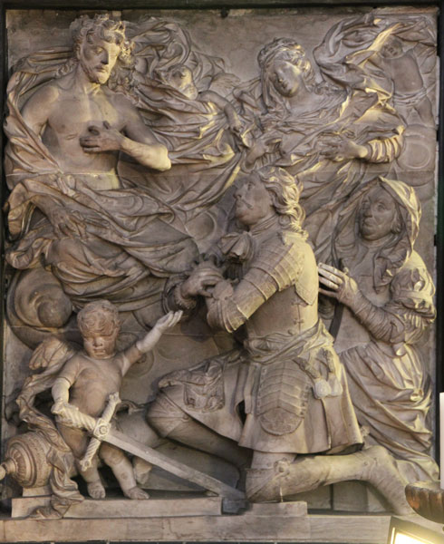Von diesem Epitaph und der zuvor beschriebenen Grabplatte spannt sich ein direkter Bogen zu dem Ostein-Epitaph schräg gegenüber, denn diese beiden Eheleute waren die Urgroßeltern des Johann Franz Heinrich Carl Sebastian Graf von Ostein (2.2.1693-23.4.1742), an den an der Nordwand des Chors mit einem Epitaph erinnert wird.