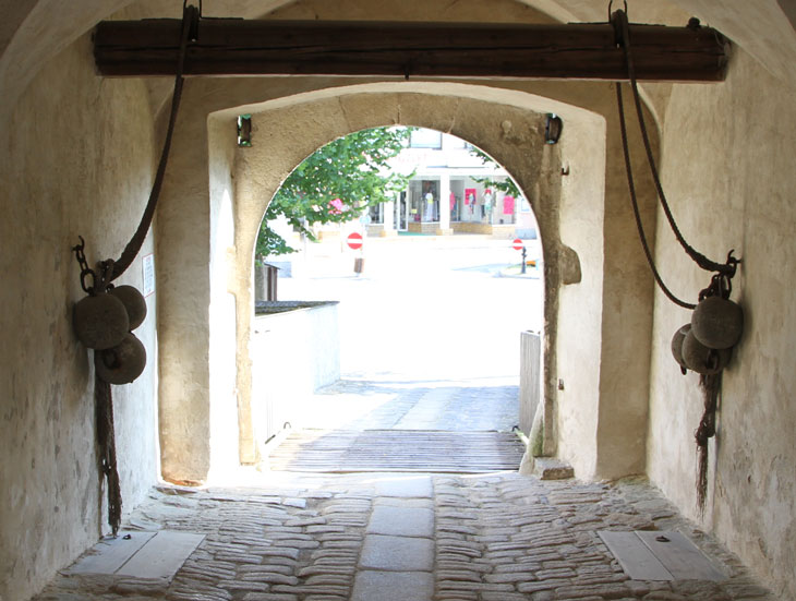 In der kreuzrippengewölbten Durchfahrt sind zwei weitere Rollen oben in einen mächtigen Querbalken eingelassen. Der Zugmechanismus war simpel, dort waren am Seil je drei Steinkugeln als Gegengewichte befestigt, so daß man die Brücke mit geringem Kraftaufwand anheben und senken konnte. Genau unter den inneren Rollen ist in der gepflasterten Durchfahrt seitlich jeweils eine hölzerne Falltür mit Ring zum Anheben, darunter ist eine Öffnung, in die die Gegengewichte abgelassen wurden beim Hochziehen der Brücke.