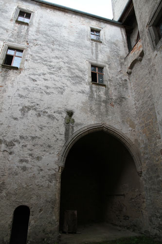 Zwischen dem Bergfried und dem vorspringenden Teil der südlichen Wohntrakte befindet sich eine zum Hof hin offene Halle mit Tonnengewölbe und einem portalförmigen, profilierten Eselsrückenbogen, neben dem oben unter einer jetzt leeren Konsole zwei Wappensteine zu erkennen sind, deren Inhalte sich nicht mehr klar erkennen und entschlüsseln lassen. Ebenfalls in der Spätgotik wurde der komplette Zwinger nördlich der Altbaumauer errichtet, mit dem Rondell an der Nordostecke, und auch im Westen entstand ein Zwinger durch Anbindung neuer Mauern an den Bergfried.