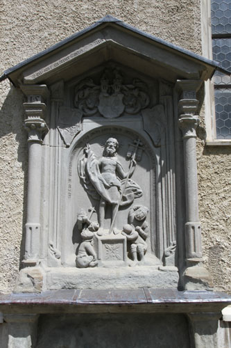 Dieses Grabmonument an der Außenseite von St. Gallus wird von zwei Säulen flankiert, die eine dreieckige Verdachung tragen. Auf den Kämpfern ist die Jahreszahl 1564 eingehauen. Unten ist als einzige Partie der stark verwitterten Inschrift zu lesen: "Der Zoller von Zollerhausen Begrebnus 1564". Das Zentralfeld zeigt in einer Bogennische die Auferstehung Christi aus dem Grabe, umrahmt von der Inschrift "Der Tod Ist verschwu(n)den durch den Si(e)g unser(e)s Herren Ihesu Christi Esa 25 Osea (?) 13 1 Cor 15 1564". Auch auf der Verdachung befindet sich eine nur noch teilweise lesbare Inschrift, die mit den Worten beginnt: "Ich weiß das(s) Dein Arloser (Erlöser) Lebet in (Himmel und E)rde ....". Wir haben also dreimal die gleiche Jahreszahl, aber keinerlei namentliche Zuordnung zu einem bestimmten Familienmitglied, die ergibt sich allein durch die Wappenkombination am Grabdenkmal.