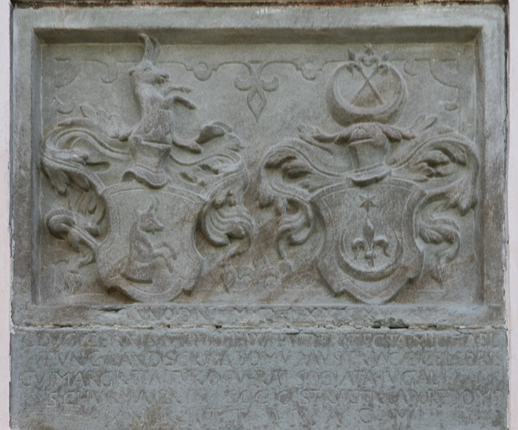 An Michael Witweiler erinnert eine auf 1596 datierte Wappentafel auf der Nordseite des Ansitzes, über einer vermauerten Rundbogenöffnung in einem gefasten Sandsteinrahmen, dem ursprünglichen Kellerzugang. Michael Witweiler war zweimal verheiratet, hier ist sein Ehewappen mit Anna Margreth Schumaier dargestellt. Das Wappen Witweiler (Witweyler) zeigt in Silber eine oberhalbe schwarze Gemse, auf dem ungekrönten Helm mit schwarz-silbernen Decken die schwarze Gemse wachsend. Es geht zurück auf eine Verleihung durch Kaiser Sigmund (reg. 1411-1437) im Jahre 1434 (Fischnaler-Wappenkartei). Das Wappen Schumaier zeigt eine liegende Mondsichel, aus der innen eine Lilie hervorwächst, im Schildhaupt ein sechszackiger Stern, auf dem ungekrönten Helm eine liegende Mondsichel, zwei schräggekreuzte Glevenstäbe umschließend, alles überhöht von einem sechszackigen Stern (ohne Beleg, Literaturhinweise und Quellen zu diesem Wappen willkommen). Der Hintergrund der Tafel ist mit Beschlagwerk verziert. Die Inschrift im unteren Bereich der Tafel ist stark verwittert. Die Datierung ist auf dem unteren Rahmen der Wappenzone in römischen Zahlzeichen eingeschlagen: "ANNO D(OMI)NI MDLXXXXVI".