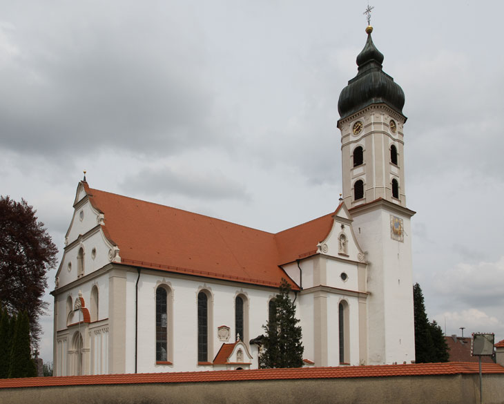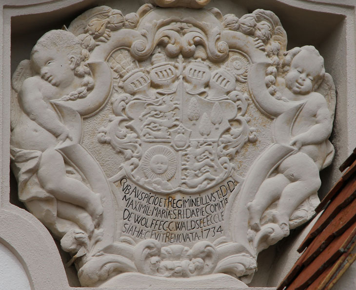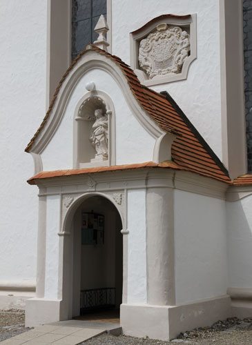 An der südlichen Längsseite ist ein kleiner Eingangs-Vorbau mit Figurennische im geschweiften Giebel angefügt, und über diesem ist an der Langhauswand ein Wappen angebracht, das von der baulichen Erneuerung 1734 zeugt. Die Inschrift lautet: "SVB AVSPICIO REGIMINE ILLVST(RI) D(OMINI) D(OMINI) / MAXIMIL(IANI) MARIAE S(ACRI) R(OMANI) I(MPERII) DAPI(FERI) E(T) COMITIS / DE WOLFFEGG WALDSEE ECCLE/SIA HAEC FVIT RENOVATA 1734" - unter der Verantwortung und der Regierung des vornehmen Herrn, des Herrn Maximilian Maria, des Heiligen Römischen Reiches Truchseß und Graf von Wolfegg-Waldsee, wurde diese Kirche 1734 erneuert.