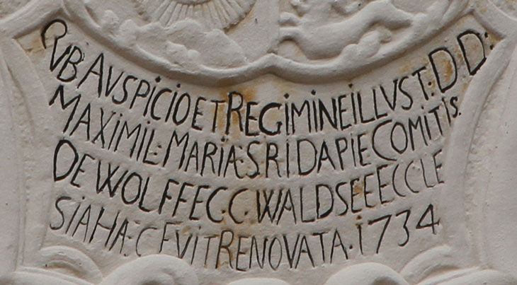 Bei dem Genannten handelt es sich um Maximilian Maria Graf von Waldburg zu Wolfegg (28.11.1684-3.4.1748), Erbtruchseß, der in erster Ehe mit Maria Ernestina von Thun vermählt war und in zweiter Ehe mit Maria Eleonora Freiin von Ulm zu Erbach (21.10.1696-16.8.1780). Der Bauherr war der Sohn von Johann Maria Franz Eusebius Erbtruchseß Graf von Waldburg zu Wolfegg (13.10.1661-1724) aus der georgischen Linie Waldburg-Wolfegg, dem Begründer der Linie Waldburg-Wolfegg-Waldsee, und dessen zweiter Frau, Marianna Josepha Gräfin Fugger von Kirchberg und zu Weißenhorn (19.3.1659-12.7.1726). Der Enkel des Bauherrn wurde 1803 in den Fürstenstand erhoben und führte diese Linie als Fürstenhaus Waldburg-Wolfegg-Waldsee weiter, das heute noch blüht.
