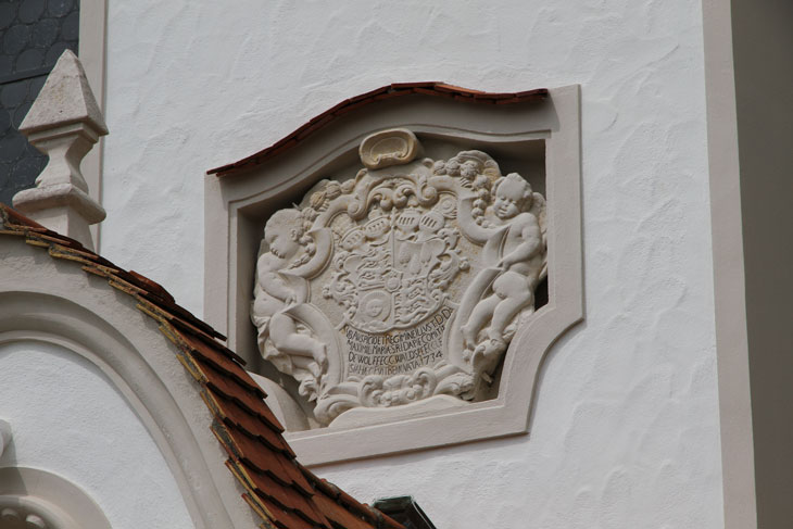 Dazu werden vier Helme geführt, die hier aber zeittypisch unterproportionierte Kleinode haben, die mit Ach und Krach in die geringen Freiräume bis zum breiten, mehrfach gebrochenen und in konkave und konvexe Bogensegmente aufgelösten Schmuckrahmen mit Akanthus- und Feston-Verzierungen eingezwängt sind: Helm 1 (innen rechts): auf dem ungekrönten Helm auf einem roten Kissen mit goldenen Quasten ein goldener Reichsapfel (Truchsessenamt), Helm 2 (innen links): auf dem gekrönten Helm eine grüne Tanne (von Tanne), Helm 3 (außen rechts): auf dem ungekrönten Helm auf einem roten Kissen mit goldenen Quasten ein grüner Pfauenfederstoß in mehreren Etagen, dahinter auf der Innenseite schräggestellt ein goldenes Fähnchen mit drei schreitenden, schwarzen Löwen übereinander (Stammkleinod, von Waldburg), wobei das Fähnchen hier bis auf einen Zipfel verdeckt ist, deshalb kann auch nicht beurteilt werden, ob hier ein Schildhaupt mit Reichsapfel wäre oder nicht, Helm 4 (außen links): auf dem gekrönten Helm ein blauer Flug, beiderseits belegt mit einer gesichteten, goldenen Strahlensonne (Grafschaft Sonnenberg). Die Decken werden von der Familie mal alle schwarz-golden (so ein Wappen des gleichen Bauherrn an Schloß Waldsee), mal alle rot-golden oder aber alternativ in den den Feldern entsprechenden Farben geführt, das wäre bei Helm 1 rot-golden, bei Helm 2 blau-golden, bei Helm 3 schwarz-golden und bei Helm 4 blau-golden. Zwei Putten dienen nicht als Schildhalter, sondern als Rahmenhalter, beide vollziehen mit ihren Körpern extreme Drehungen in der Längsachse, besonders der optisch rechte mit einer anatomisch fragwürdigen 150°-Drehung in der Hüfte. Ein weiteres Wappen dieses Bauherrn ist übrigens im Mittelgiebel des von ihm umgebauten Schlosses in Bad Waldsee angebracht.