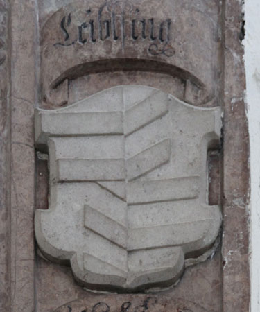 Johann Ulrich von Pirching hatte seinerseits Johanna Katharina von Leublfing geheiratet. Ganz unten auf der Grabplatte sind die beiden Wappen dieses Ehepaares dargestellt. Heraldisch rechts befindet sich das vermehrte Wappen der von Pirching, wie es am 5.11.1630 zu Regensburg diesem Johann Ulrich von Pirching (Pürching) zu Sigharting, reichserbländisch kurbayrischer Hofrat und Truchseß, sowie seinem Bruder Georg Ehrenreich von Pirching und seiner Schwester Anastasia von Pirching, zusammen mit dem Freiherrenstand als Wappenbesserung verliehen worden ist. Es handelt sich um die Vereinigung ihres angestammten Wappens mit jenem des ausgestorbenen und mit ihnen verwandten Geschlechts der von Nußberg (österreichisches Staatsarchiv AT-OeStA/AVA Adel RAA 319.6). Das Wappen ist geviert, Feld 1 und 4: golden-schwarz schräggeteilt mit drei auf die Teilungslinie schräglinks gelegten Rauten in verwechselten Farben (von Pirching), Feld 2 und 3: in Rot ein in drei Reihen blau-silbern balkenweise links gerauteter Balken (von Nußberg), dazu werden zwei gekrönte Helme geführt, Helm 1 (rechts): zu schwarz-goldenen Decken ein Flug, beiderseits wie der Schild bezeichnet (von Pirching), Helm 2 (links): zu rot-silbernen Decken ein silberner Federbusch (von Nußberg).