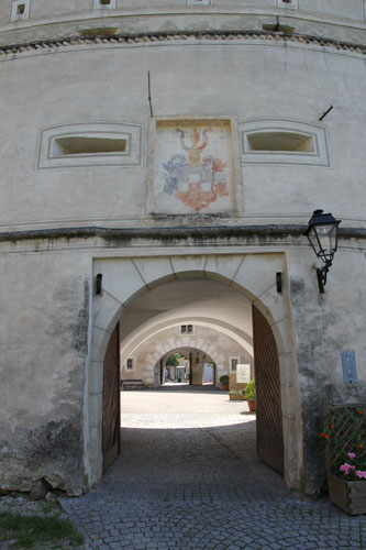 Die Ernstbrunner Linie erlangte 1610 den Freiherrenstand und 1613 den niederösterreichischen Herrenstand. 1625 erlangte die Familie das Erbschenkenamt, und genau deshalb wird in der Helmzier jeweils der goldene Schenkenbecher zwischen die Büffelhörner gesetzt. Das Erbschenkenamt der von Sinzendorf war jedoch kein Reichsamt. Reichserzschenk war der König von Böhmen. Das Erbschenkenamt im Reich hatten zuerst die Schenk von Limpurg inne, und nach deren Erlöschen ging es an die Grafen von Althann. Die von Sinzendorf hatten vielmehr das Erbschenkenamt nur in Österreich ob der Enns (Oberösterreich) inne. Mehr zu den Ämtern der Familie im Kapitel zu Schloß Ernstbrunn. Eines dieser beiden gemalten Wappen an den Rondell-Toren, das an der Westseite (beide Abb. oben), zeigt nur dieses Sinzendorf-Wappen mit der Inschrift "H. I. H. V. S. E. A. H. E. R. I. P. V. S. I. O. D. E. / CHR(ISTO) / DVCE". August Herr von Sinzendorf hatte das Oberst-Erbmundschenkenamt in Österreich ob der Enns inne, das Oberst-Erbland-Vorschneideramt, das Schildträger und Kampfrichteramt in Österreich ob und unter der Enns und er war kaiserlicher Kämmerer. Aufgrund der Initialen ist dieses einzelne Wappen jedoch seinem Sohn zuzurechnen, Johann Joachim Graf von Sinzendorf-Ernstbrunn (-11.11.1665), denn der Beginn der Abkürzung läßt sich zu "H(ans). I(oachim). H(err). V(on). S(inzendorf). E(rnstbrunn). ..." auflösen.