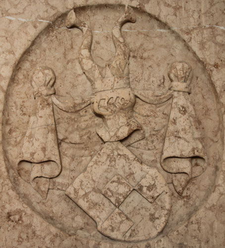 Das andere an der Ostseite ist ein Allianzwappen (Abb. oben, beide Abb. unten), und darüber steht nur die Devise "CHRISTO DVCE". Die Schildfläche ist leer, nur zwei der drei Kleinode sind zu erkennen. August Herr von Sinzendorf hatte Elisabeth von Trauttmansdorff (5.5.1587-29.5.1652) geheiratet, und dazu passen diese beiden Kleinode; es stellt folglich ihrer beider Ehewappen dar. August von Sinzendorf hatte die Barbekane um ein Geschoß aufstocken lassen, und das Wappen an der Ostseite wurde ca. 1625-1648 angebracht. Helm 1 (Mitte): auf dem Helm mit rot-silbernen Decken eine silbern-rot gespaltene Rose (fehlt hier) vor einem rot-silbern gespaltenen Straußenfederbusch (Stammhelm Trauttmansdorff), Helm 3 (links): auf dem Helm mit rechts rot-silbernen, links rot-goldenen Decken ein wachsender wilder Mannesrumpf mit spitzen Ohren wie ein Faun (Höltzler, Hölzl von Lueg) zwischen zwei Büffelhörnern, das rechte rot-golden, das linke silbern-rot zu je sechs Plätzen geschacht (von Kirchberg). Diese beiden Kleinode sieht man gut in der Abb. unten rechts. Das Wappen wird beschrieben im Siebmacher Band: Mä Seite: 248 Tafel: 175, Band: FstA Seite: 266 Tafel: 359-360, Band: NÖ Seite: 379 Tafel: 183. Von Helm 2 (rechts) ist nur die Mündung eines Büffelhorns zu sehen, das war wohl einmal zu rot-silbernen Decken ein wachsender, graubärtiger Mannesrumpf in mit drei roten Schrägrechtsbalken belegtem, silbernem Rock mit silbernem Kragen und spitzer, silberngestulpter, roter, heidnischer Mütze zwischen zwei silbern-rot geschachten Büffelhörnern (von Castelalt/Castellalt). Das wäre die Form des Wappens, wie sie 1563-1805 geführt wurde. Damit läßt sich auch der Schildinhalt rekonstruieren; angemessen wäre geviert mit Herzschild, Feld 1: silbern-rot fünfmal schrägrechtsgeteilt (von Castelalt, Castellalt), Feld 2 und 3: in Silber drei übereinandergestellte eingebogene rote Dreiecke (Höltzler, Hölzl von Lueg), Feld 4: von Rot, Silber und Gold halbgespalten und geteilt (Kirchberg), Herzschild: rot-silbern gespalten mit einer Rose in verwechselten Farben (Stammwappen Trauttmansdorff).