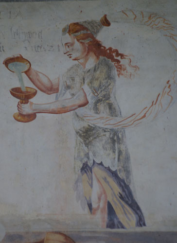 Abb. links: ein fröhlicher draller nackter Bacchus, Gott des Weines und des blühenden Lebens. Abb. rechts: Allegorie der Temperantia = Mäßigung, beim Abmessen eines Getränks.
