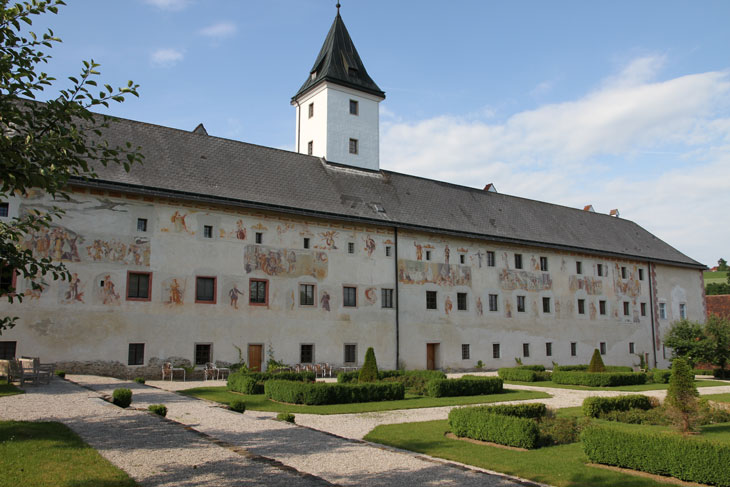Die Fassadenmalereien der über 90 m langen Südfassade sind ein Höhepunkt österreichischer Renaissancekunst. Insgesamt 600 m2 wurden mit Allegorien, antiken Göttern, biblischen und mythologischen Szenen bemalt. Die 1986 von Graf Spiegelfeld-Schneeberg wiederentdeckten und in den nachfolgenden Jahren freigelegten Fresken sind um 1580 entstanden. Was sie so einzigartig macht, ist nicht nur die Qualität ihrer Erhaltung und ihre gute Restaurierung, sondern auch die riesige Dimension des Bildprogramms und die Ikonographie, denn sie sind mit ihren manchmal provozierenden Details ein Spiegel der Weltanschauung eines humanistisch gebildeten und protestantischen Landadeligen im Spannungsfeld der Auseinandersetzungen zwischen den Konfessionen. Eine Schlüsselszene ist das Konfessionsbild, wo das protestantische Gottesvolk vom Pharao in Gestalt des Papstes verfolgt wird, und in Gesellschaft des Papstes befinden sich alle Gegner der Protestanten: Bischof, Kardinal, Türken und Franzosen. Die moralische Überlegenheit des Protestantismus wird in solchen Szenen deutlich gemacht. Fast 450 Jahre nach ihrer Entstehung beeindrucken diese Fresken noch durch ihre Farbigkeit und ihren phantasievollen Detailreichtum, anhand dessen man die Mode und das Leben zu jener Zeit gut studieren kann.