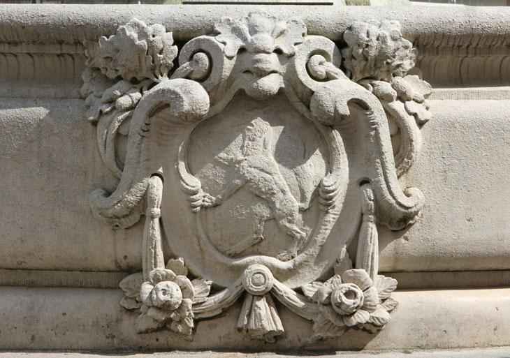 Die am Brunnentrog angebrachte und von Blumen- und Fruchtgebinden umspielte Wappenkartusche zeigt den Passauer Wolf, der rot in silbernem Feld erst als Hochstiftswappen und dann als Stadtwappen von Passau geführt wurde. Für das Fürstbistum Passau ist dieses Wappenbild seit dem 13. Jh. belegt. In der um 1350 entstandenen Züricher Wappenrolle wird schon der Passauer Wolf auf der Fahne des Bischofs dargestellt. Die Stadt übernahm das Symbol vom Hochstift; seit dem Arlberger Wappenbuch ist der Passauer Wolf als Symbol der Stadt um 1402 nachweisbar. Zunächst wurde das Wappen in Kombination mit dem hl. Stephanus geführt. Der Stadt wurde 1432 im sogenannten "Fünferspruch" der Wolf als alleiniges Symbol bewilligt. Seit dem Siebmacher von 1605 wurde dem Wolf ein blauer Schrägbalken aufgelegt, zur Unterscheidung vom Hochstiftswappen, was sich aber nicht durchsetzte und ab 1803 überflüssig war, da es das Hochstift seit der Säkularisation nicht mehr gab. In der Neuzeit ist es umgekehrt, nicht die Stadt differenzierte sich heraldisch vom Fürstbistum, sondern das Bistum von der Stadt, denn das moderne Bistum Passau, die Diözese also, führt in Silber unter einem schwarzen, mit einem goldenen durchgehenden Balkenkreuz belegten Winkelschildhaupt einen roten Wolf, der in seinen Vorderpranken einen goldenen Bischofsstab hält. Die dritte Kartusche (ohne Abb.) am Brunnenbecken trägt das Wappen des Königreichs Bayern.