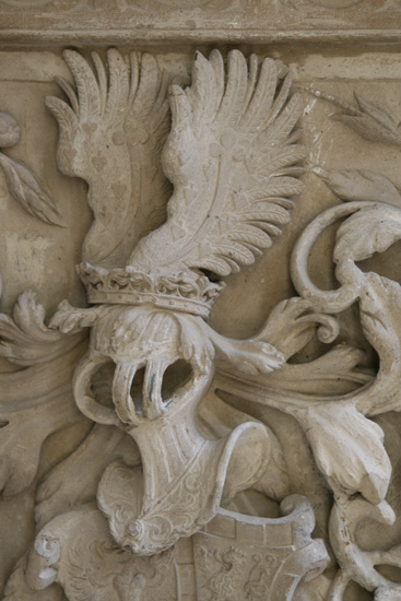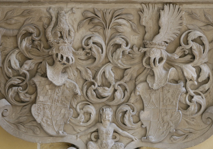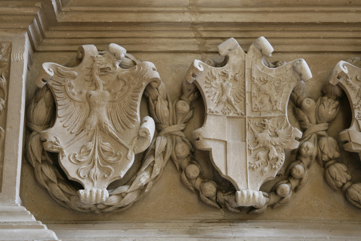 Entsprechend sehen wir heraldisch rechts das vollständig gewendete pfalzgräfliche Wappen, geviert, Feld 1 und 4: Pfalz, in Schwarz ein goldener, rot bewehrter und ebenso gekrönter Löwe, Feld 2 und 3: Wittelsbach-Bayern, silbern-blau schräggerautet, auf dem gekrönten Helm mit schwarz-roten Decken zwischen einem blau-silbern schräggerauteten Paar Büffelhörnern ein goldener, gekrönter und rot bewehrter Pfälzer Löwe, und heraldisch links das markgräflich-brandenburgische Wappen, geviert, Feld 1: Markgrafschaft Brandenburg, in Silber ein roter, golden bewehrter Adler, Feld 2: Burggrafschaft Nürnberg, innerhalb eines silbern-rot gestückten Bordes in Gold ein schwarzer Löwe, Feld 3: Grafschaft Hohenzollern, silbern-schwarz geviert, Feld 4: Herzogtum Pommern, in Silber ein roter, golden bewehrter Greif, auf dem gekrönten Helm mit rot-silbernen oder schwarz-silbernen Decken ein schwarzer, mit goldenen Kleestengeln belegter und mit gestürzten silbernen oder goldenen Lindenblättchen bestreuter Flug. Die Wappen werden beiderseits von je einem bekleideten Eroten und unten von einem hockenden Satyr oder Faun begleitet.