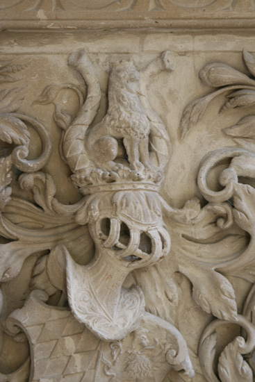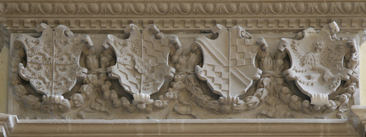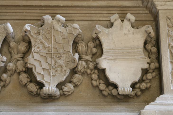 Insgesamt gibt es am Epitaph 10 Wappen, zwei Vollwappen und acht Wappenschilde, erstere für die Eltern und letztere als Ahnenprobe, erstere auf dem Unterhang und letztere in zwei Viergruppen in der Sockelzone und in der Gebälkzone. Beginnen wir mit den Wappen ihrer Eltern: Alberta Pfalzgräfin bei Rhein war die älteste Tochter von (1) Friedrich II. von Pfalz-Simmern (14.2.1515-26.10.1576), der ab 1559 als Friedrich III. Kurfürst von der Pfalz war, und seiner ersten Frau, (2) Markgräfin Maria von Brandenburg-Kulmbach (1519-31.10.1567). Die Beiden hatten 1537 in Crailsheim geheiratet.