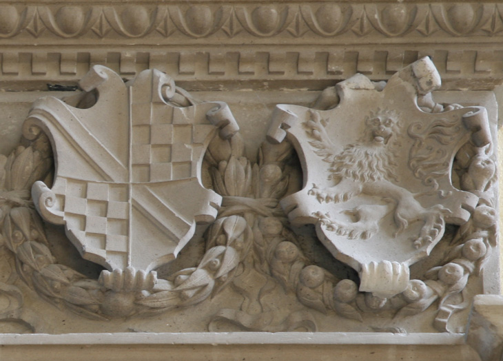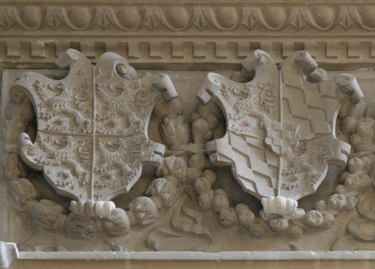 Die nächsten beiden Wappenschilde stehen für (4) die Herzöge von Bayern, geviert, Feld 1 und 4: Pfalz, in Schwarz ein goldener, rot bewehrter und ebenso gekrönter Löwe, Feld 2 und 3: Wittelsbach-Bayern, silbern-blau schräggerautet, und (8) die Erzherzöge von Österreich, in Rot ein silberner Balken.